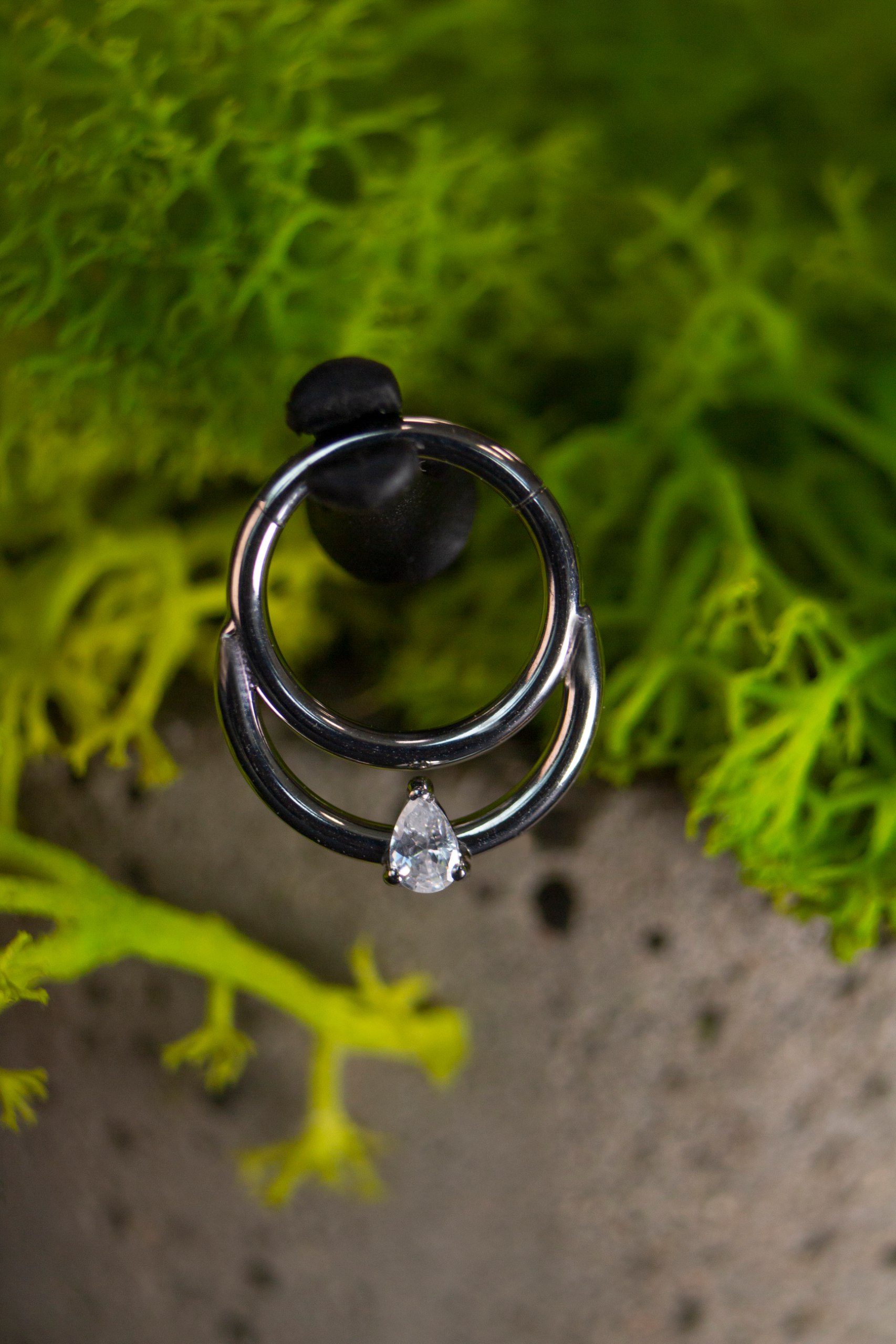 Кольцо-кликер из титана ASTM F-136, двойное, металлического цвет, украшено двумя рядами блестящих камней.